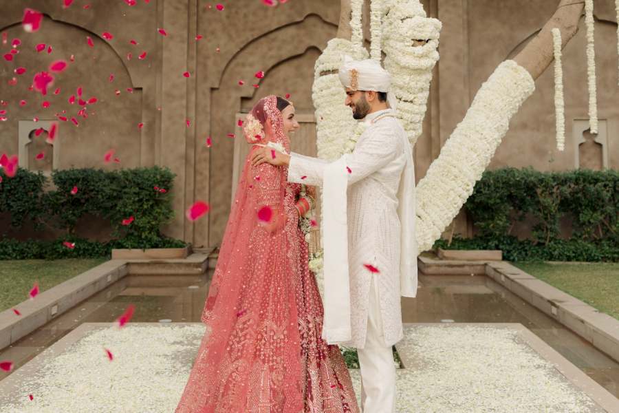 The couple exchanged garlands during the ceremony as guests showered rose petals on them.