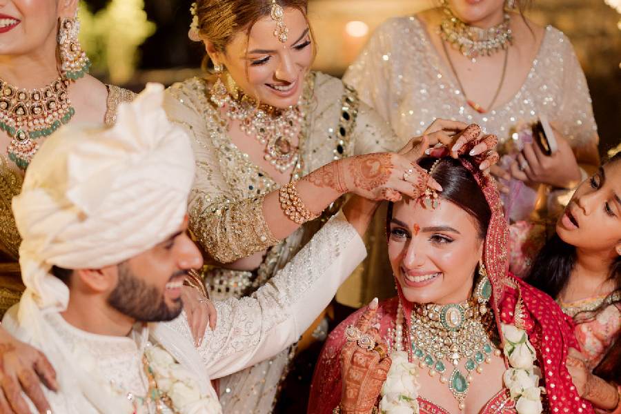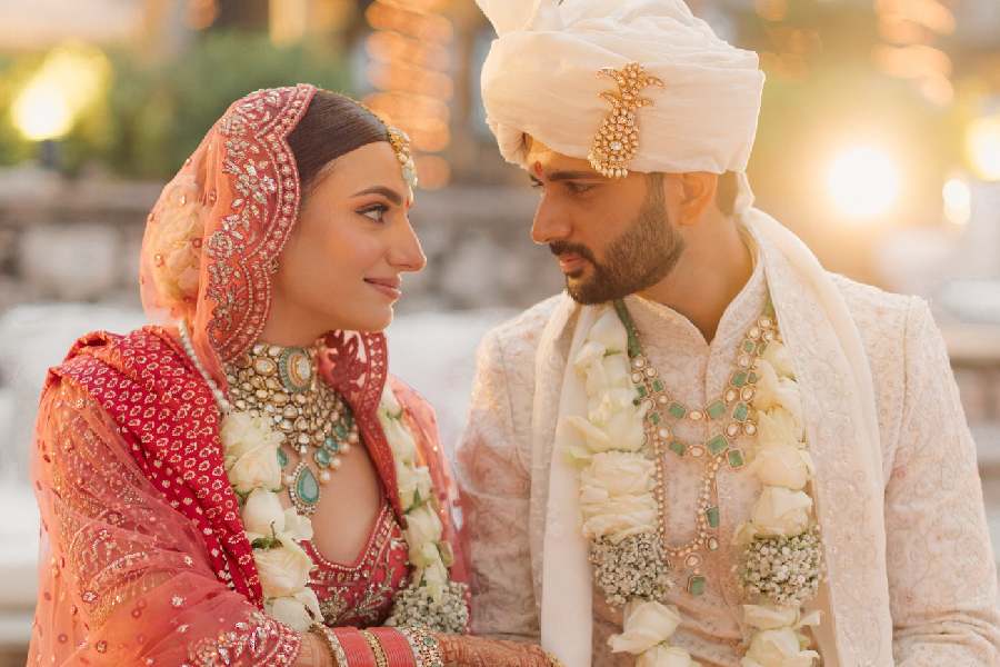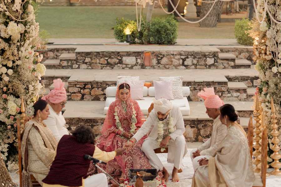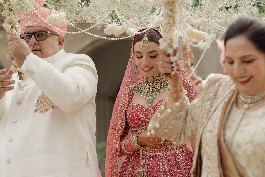 Prakriti and Vinay gazed into each other’s eyes. While the bride looked gorgeous in a reddish pink lehenga choli and polki jewellery, the groom looked dapper in a white sherwani suit.