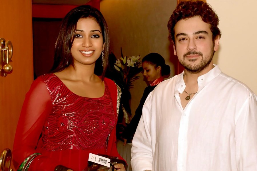 Singer Shreya Ghosal, in a red ethnic wear, posed beside Adnan at the latter’s residence.