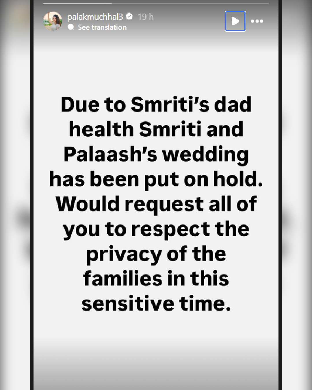 “Due to Smriti's dad health Smriti and Palaash's wedding has been put on hold. Would request all of you to respect the privacy of the families in this sensitive time,” reads Palak’s Instagram story.