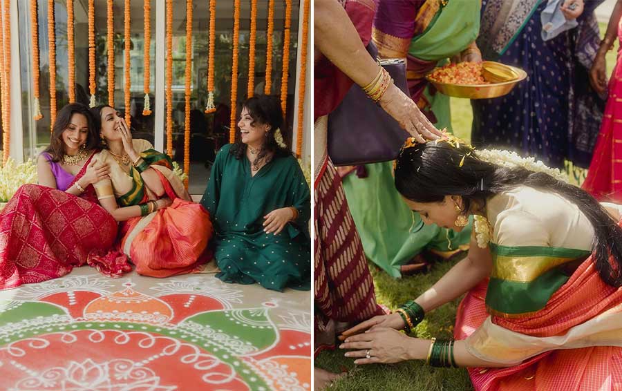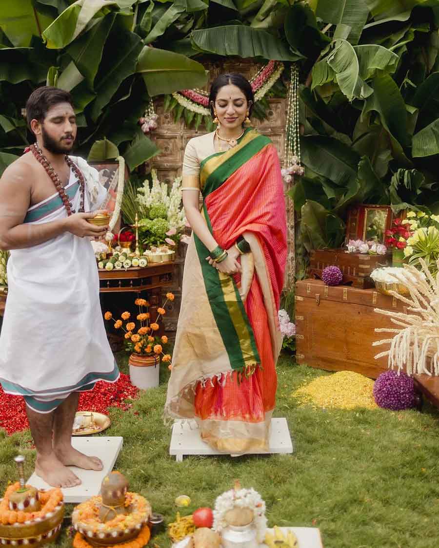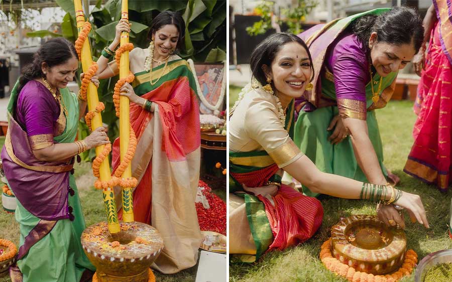 During the ceremony, Sobhita was surrounded by her close friends and family, including her sister Samanta, who also attended her August 8 engagement in Hyderabad. The carousel captures Sobhita touching the feet of her elders and seeking their blessings.