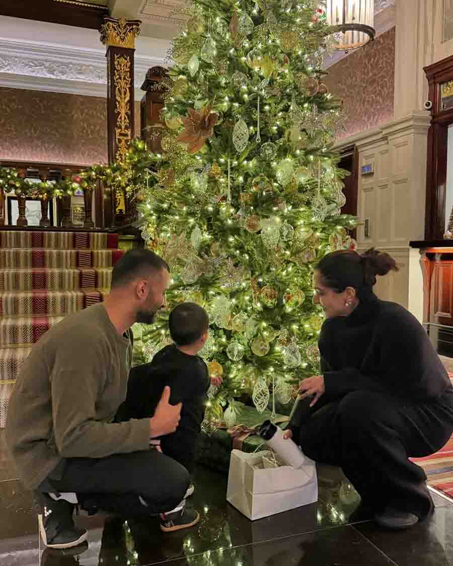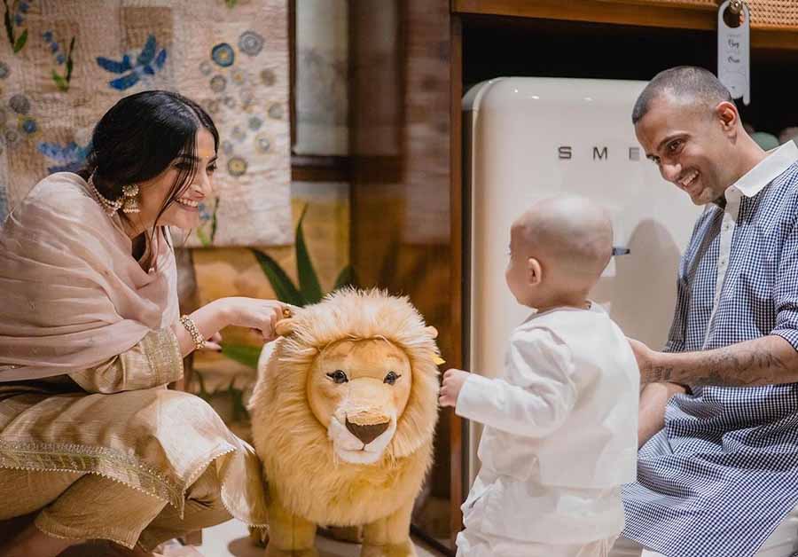 On Vayu’s first birthday, Sonam donned a golden three-piece salwar suit, while Anand sported a blue checkered Kurta. The birthday boy sported an all-white two-piece kurta suit.