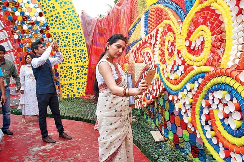 Squash champ Saurav Ghosal and actress June, True Spirit Puja judges on the East route, are click happy at the innovative Rashmoni Bagan Kishore Sangha pandal, a Three Star Puja, made out of paper cups and papier mache. “I gave points to them because they used bio-degradable things to make an eco-friendly pandal. It will appeal to the kids because it’s so colourful,” said June.