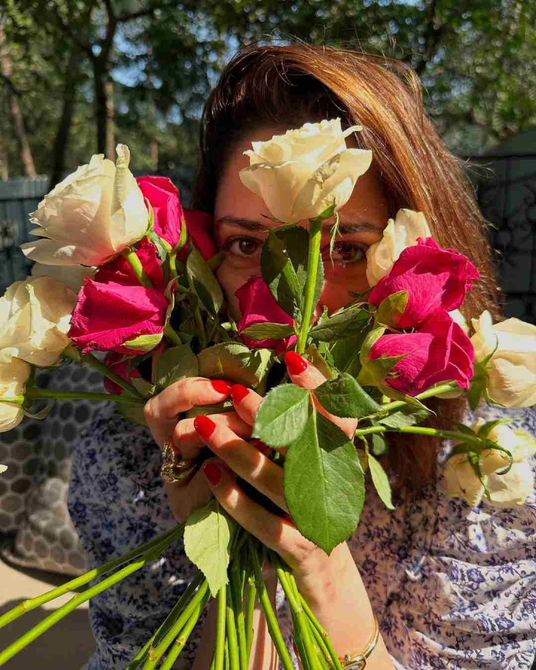 The Baahubali actress playfully hid her face behind a bouquet of roses while enjoying the serene beauty of Goa.