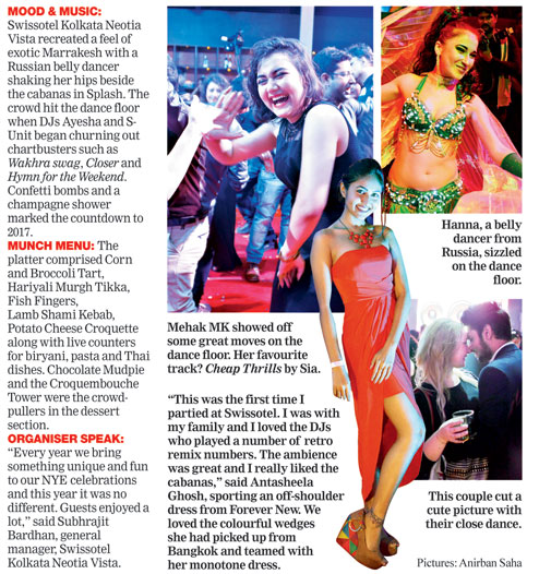 Mood & music: Swissotel Kolkata Neotia Vista recreated a feel of exotic Marrakesh with a Russian belly dancer shaking her hips beside the cabanas in Splash. The crowd hit the dance floor when DJs Ayesha and S-Unit began churning out chartbusters such as Wakhra swag, Closer and Hymn for the Weekend. Confetti bombs and a champagne shower marked the countdown to 2017.