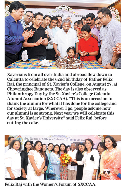 Xaverians from all over India and abroad flew down to Calcutta to celebrate the 62nd birthday of Father Felix Raj, the principal of St. Xavier’s College, on August 27, at Chowringhee Banquets. The day is also observed as Philanthropy Day by the St. Xavier’s College Calcutta Alumni Association (SXCCAA). “This is an occasion to thank the alumni for what it has done for the college and for society at large. Wherever I go, people ask me how our alumni is so strong. Next year we will celebrate this day at St. Xavier’s University,” said Felix Raj, before cutting the cake.