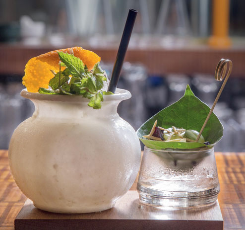 Aam Panna lovers, rejoice. The Monkey Bar signature cocktail has aam panna stirred with vodka, sweet lime, cumin and salt to make a tangy cocktail in a ceramic glass.
