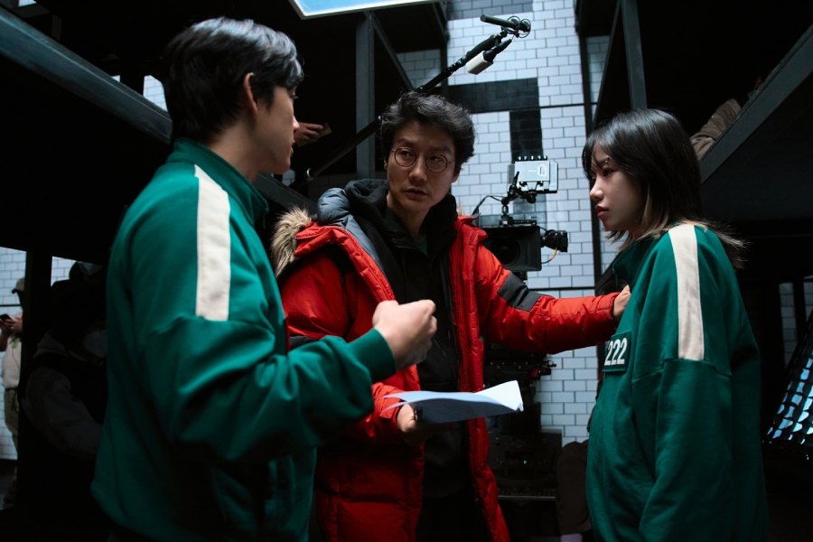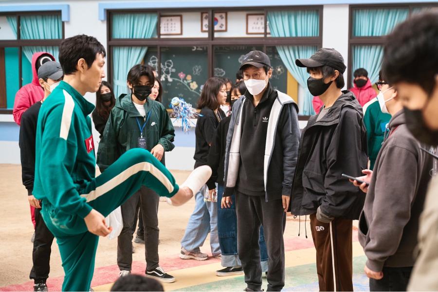 The director appeared to be explaining a scene to the actors Yim Si-wan and Jo Yuri, who joined the cast of Season 2 as new participants in the game.