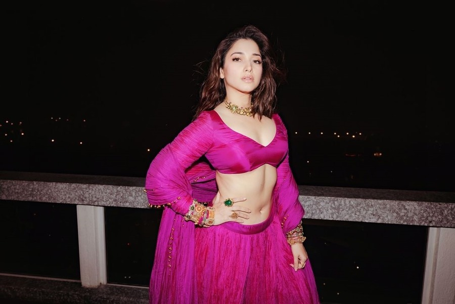 Tamannaah Bhatia’s rani pink Abu Jani Sandeep Khosla lehenga is striking for its lack of embellishments. A stack of stone-studded bangles, a floral neckpiece and chunky finger rings complete her look.