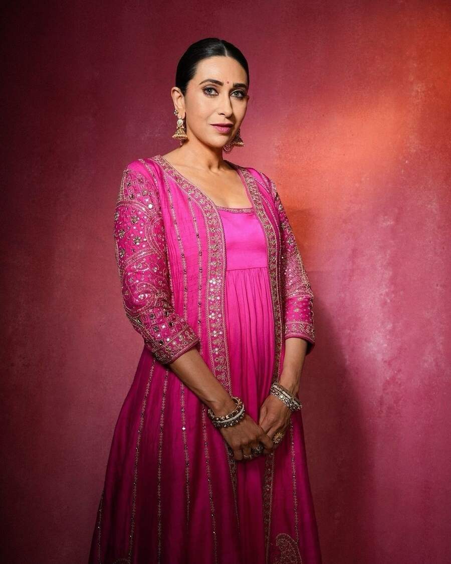 For a recent television appearance, Karisma Kapoor teamed her embellished pink Anarkali with jhumkas, finger rings and a neat braid.