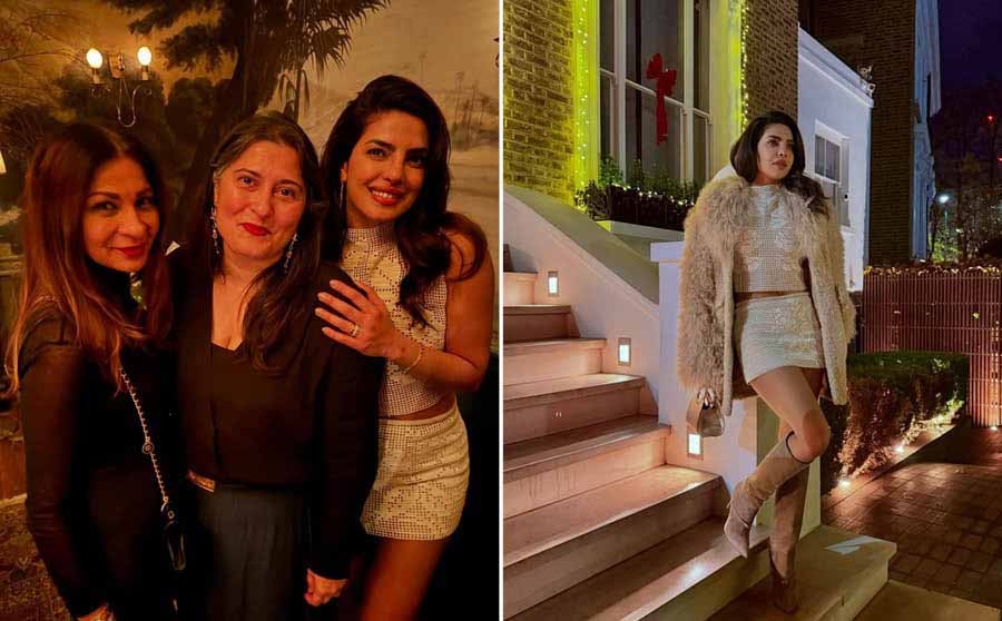 Priyanka Chopra Jonas, who is currently shooting for Ilya Naishuller’s Heads of State in London, dropped pictures with her friends Anjula Acharia and Sharmeen Obaid Chinoy. The actress looked stunning in a white co-ord set comprising a crocheted top and a matching mini skirt. Priyanka layered her outfit with a fur coat. The Citadel actress opted for a beige handbag and knee-length boots to round off her stylish look for the night.