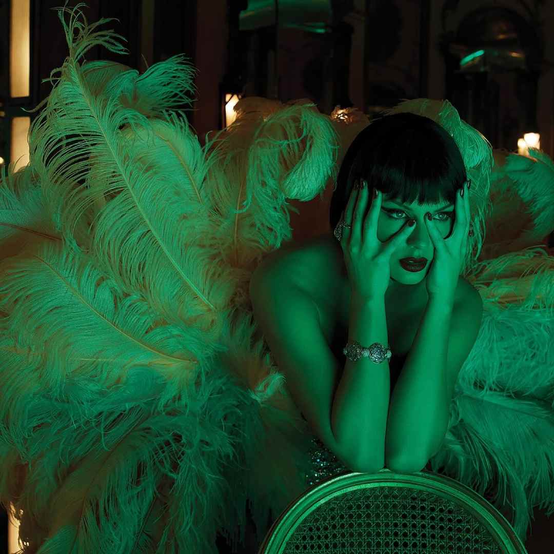 In the cover picture of the album, Taylor Swift was seen lying in a pool. The 35-year-old singer appeared in a crystalline bralette and lines of scallop-shaped diamonds coating her torso.