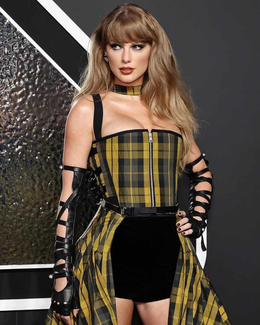 Taylor Swift, who clinched seven trophies at the event, rocked a striking yellow-and-black plaid corset with bold black straps and an asymmetrical skirt over a velvet underlay. Soft waves and dramatic makeup completed her punk-inspired look.