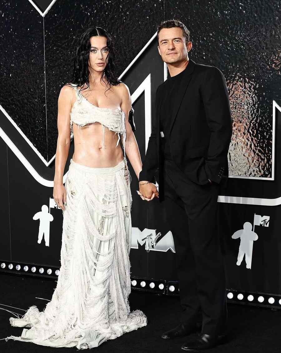 Katy Perry, who bagged the Michael Jackson Video Vanguard Award, donned a one-shoulder crop top and a floor-length skirt by US label Who Decides War. Perry posed with her beau, actor Orlando Bloom, who attended the award show in an all-black suit.
