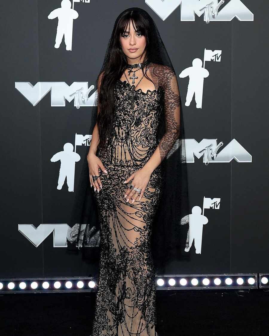 The Havana singer Camila Cabello wore a sheer black lace gown with a nude underlay and a dramatic black cape. She completed her gothic look with a bold cross necklace.