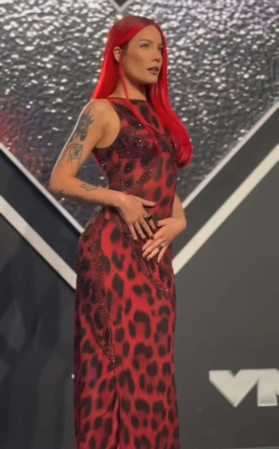 Halsey stunned in an archival red Versace gown, last worn by Elizabeth Hurley in 1996.