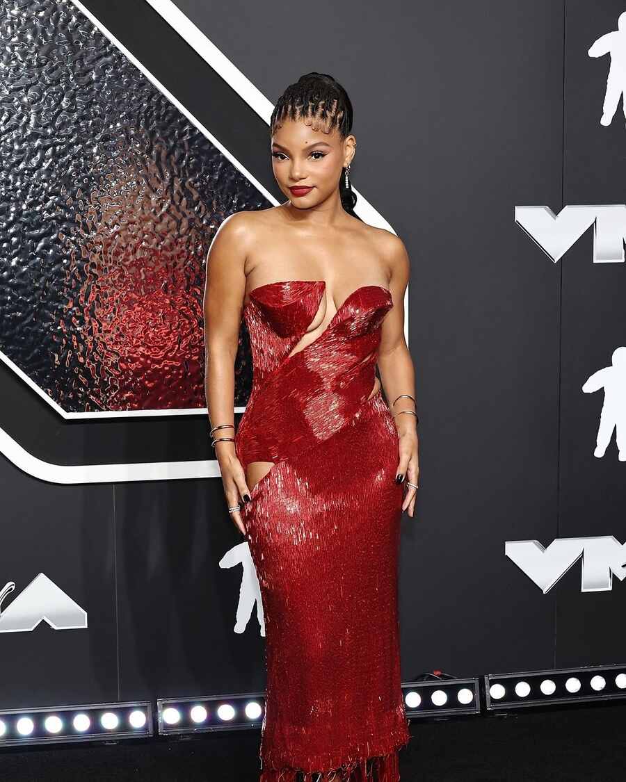 Actress Halle Bailey wore a stunning red Sophie Couture gown at the 2024 MTV VMAs. The dress featured a plunging neckline, hip cutouts, shimmery beads, and a fringed hemline.