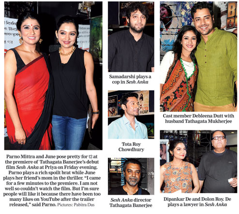 Parno Mittra and June pose pretty for t2 at the premiere of Tathagata Banerjee’s debut film Sesh Anka at Priya on Friday evening. Parno plays a rich spoilt brat while June plays her friend’s mom in the thriller.