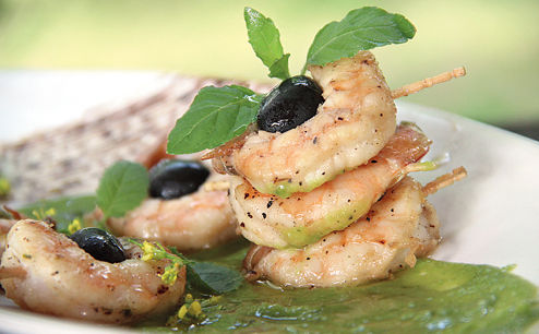 Prawn Olivette: Simple yet delicious. This Italian dish consists of blanched prawn, skewered with olives. The basil oil emulsion is a great accompaniment with the dish.