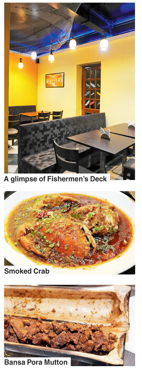 Once you settle down with the new food dictionary, take a look around. Decor-wise, one half of the 40-seater den is done up in a tribal look, while the other has a fisherman’s net cast on the ceiling, in sync with the seafood it offers, including octopus and squid which, thankfully, are slowly emerging on Calcutta’s food map (think Santa’s Fantasea, which also has a tribal and seafood menu, Ocean Grill and Ecstasea).