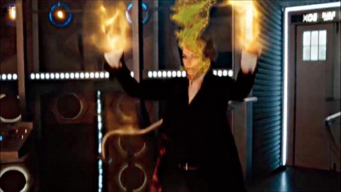 But hers is a baptism of fire, metaphorically and literally. As she presses a button, the burning Tardis, the space machine in which all Dr Whos have traversed the cosmos in time and space, begins lurching violently. She attempts desperately to cling on but is tossed out above Earth.