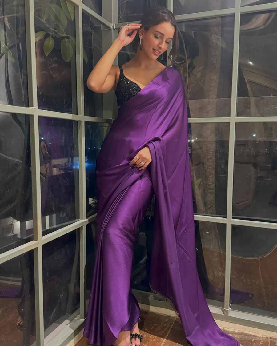 Animal actress Triptii Dimri draped a purple silk sari over a sequined black blouse, with a low-bun, strappy heels and danglers.