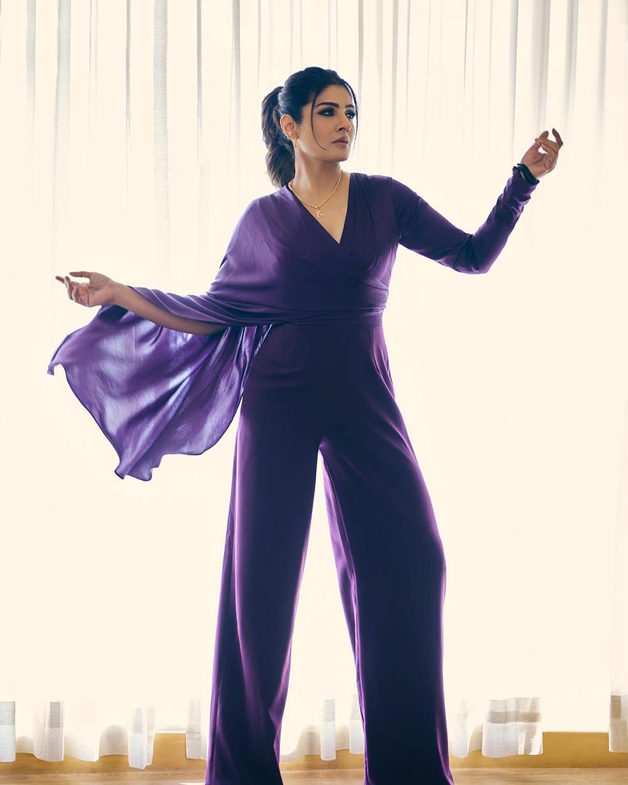 Raveena Tandon looks sharp in a purple jumpsuit with a plunging neckline and a short drape around the right shoulder. She accessorised the look with an ‘R’ pendant on a gold chain.