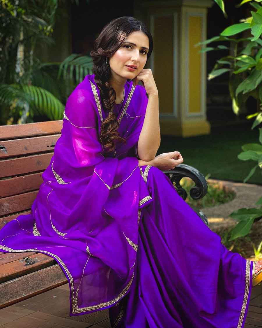 Fatima Sana Shaikh’s Raw Mango purple sari look is elegant in its simplicity. The Dhak Dhak actress braided her hair and went with dewy makeup.