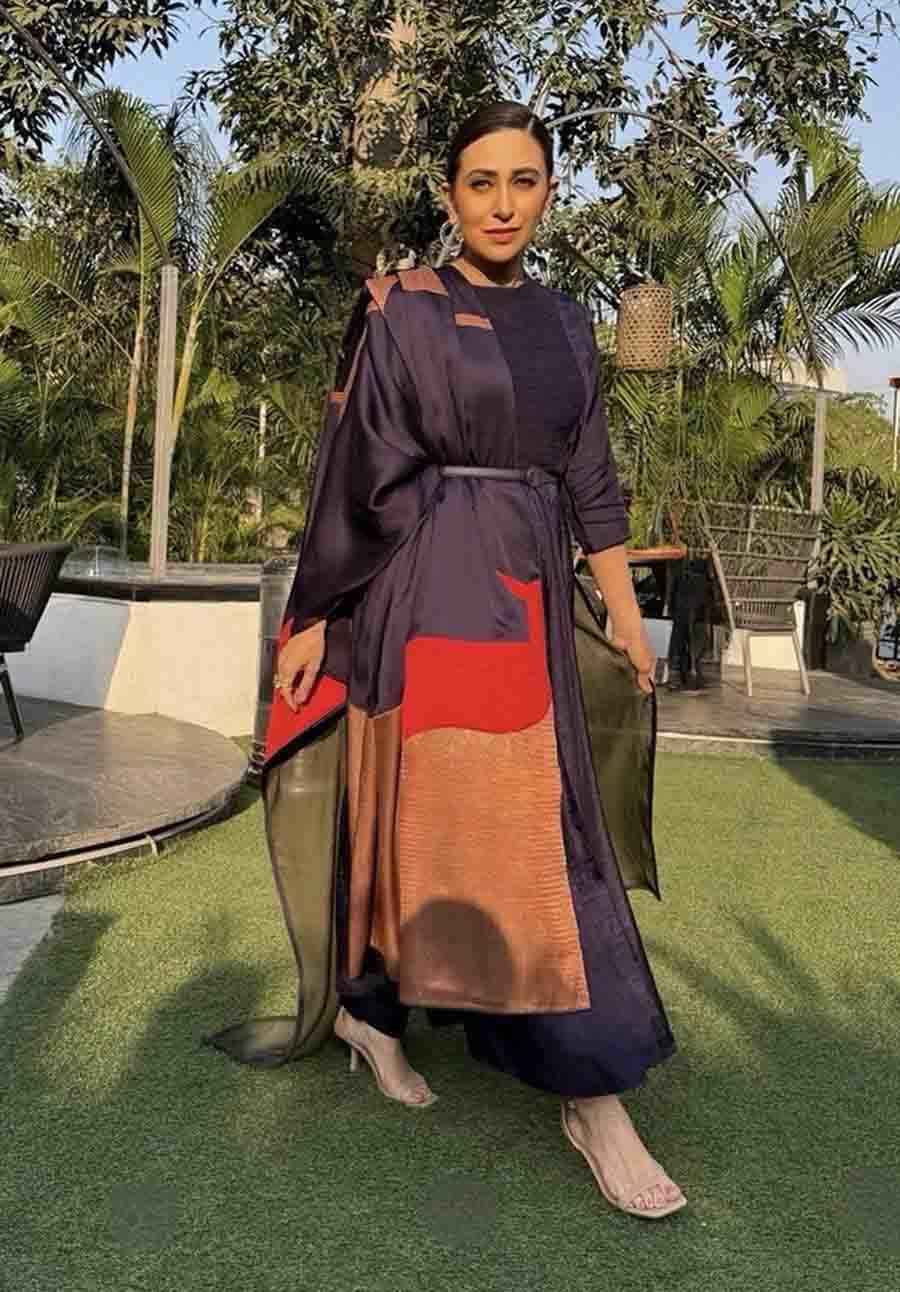 Karisma Kapoor flaunted a purple suit with a colourblocked dupatta secured at the waist with a matching belt. Nude makeup and a sleek hairdo balanced the look.