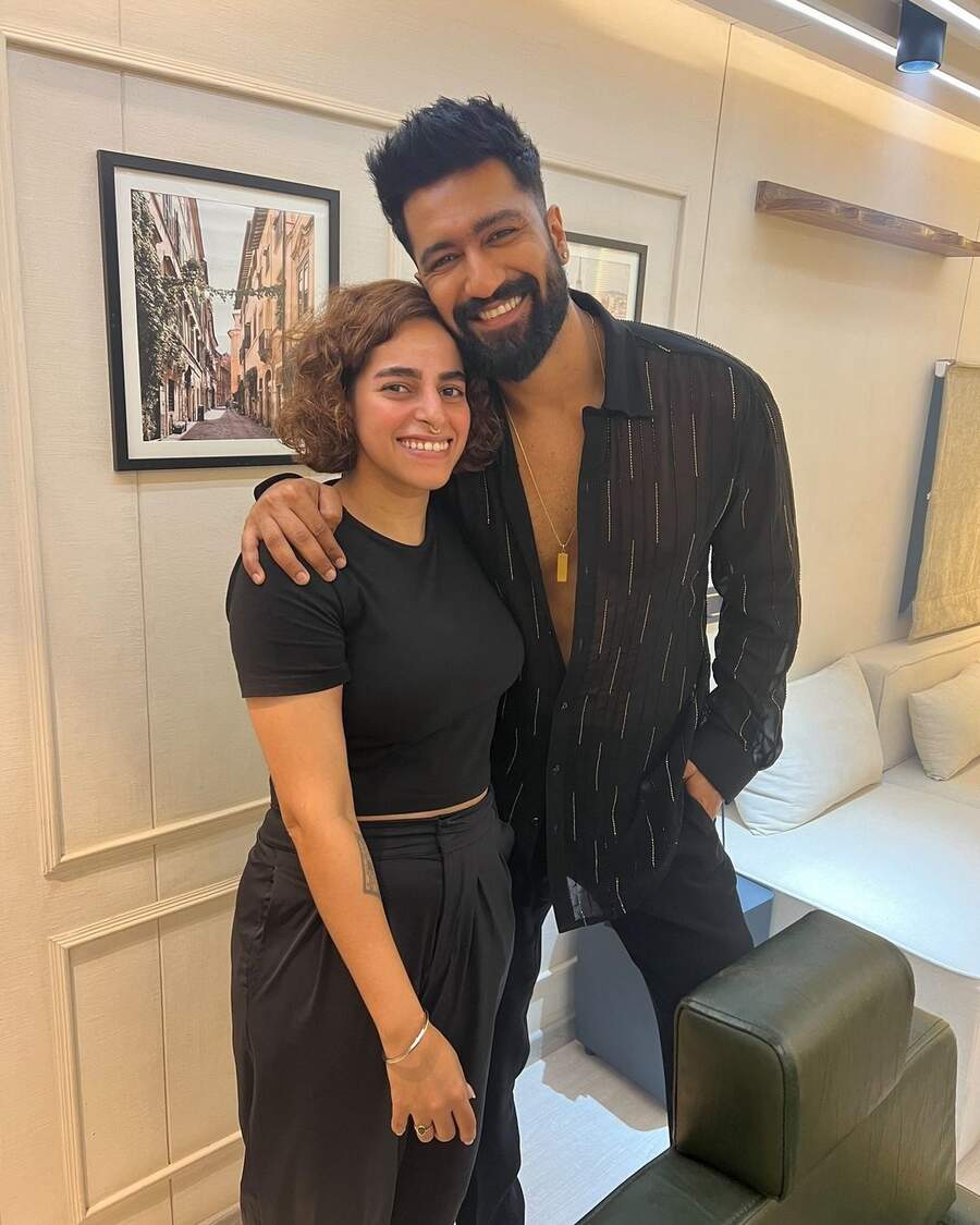 Vicky Kaushal, who plays Akhil Chaddha in the film, looked dapper in an all-black ensemble. He left his shirt unbuttoned and paired it with matching trousers. The 36-year-old actor has been winning the internet with his electrifying dance moves in songs like Tauba Tauba and Raula Raula from the film.