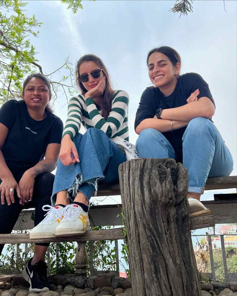 Triptii appears to have formed a close bond with the crew members.In another photo with Nikita, the actress is seen in a green-and-white t-shirt, which she paired with flared jeans. Black wayfarers perfectly complemented her casual look.