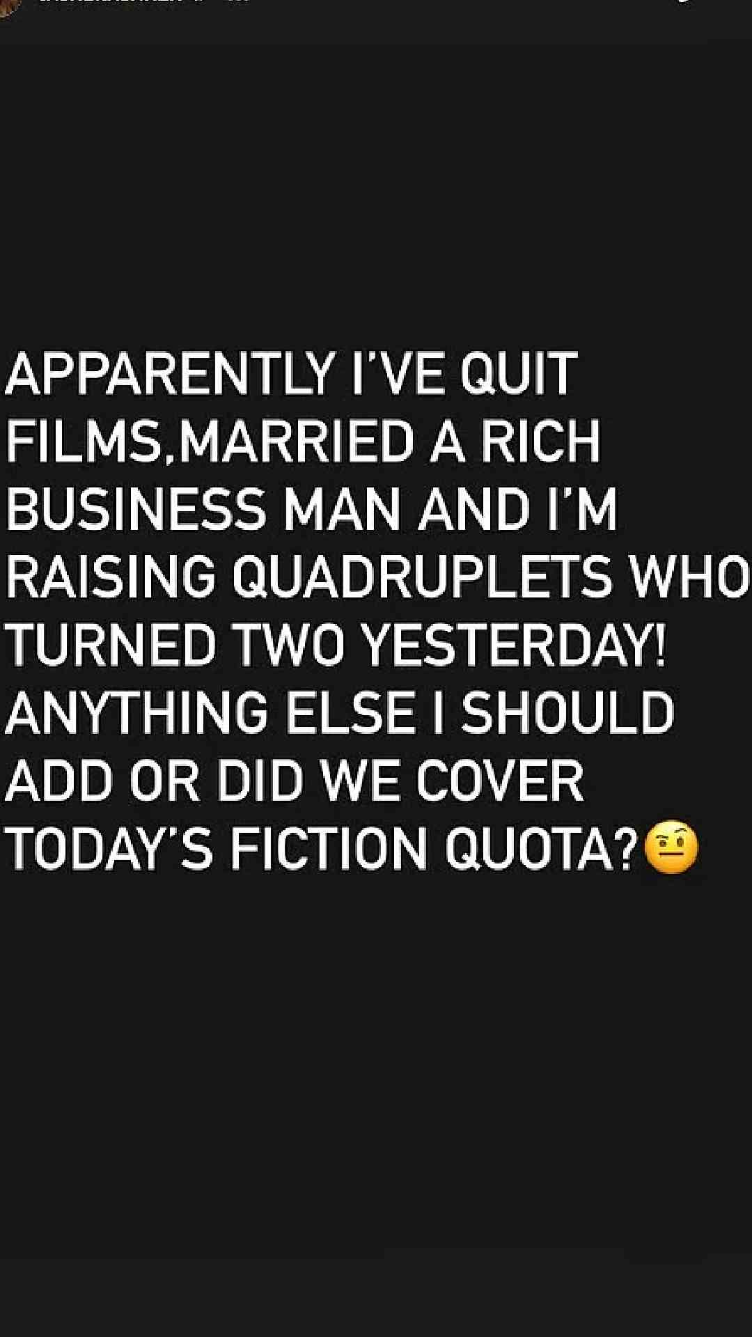 “Apparently I’ve quit films, married a rich businessman and I’m raising quadruplets who turned two yesterday! Anything else I should add or did we cover today’s fiction quota?” she wrote.