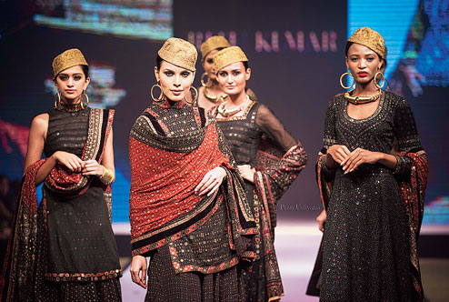 Ritu Kumar draws on the craft forms of Rajasthan for her Thar Desert Collection, which she showcased at the Rajasthan Heritage Week recently. A kaleidoscope of crafts from the desert land — ajrakh print, embroidered wool patchwork and mica mirror-work bandhni — form the line. “The richness of the desert land never fails to stimulate the sensibility of Indian designers. Keeping in line with my revival work, the collection highlights the crafts of the handloom khadis from Jaisalmer. I have particularly focused on ajrakh, a form of block printing, which has a