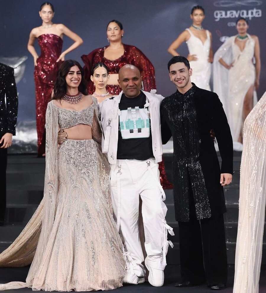Vedang and Khushi posed with Gaurav Gupta on the ramp after a successful show. Gupta’s couture collection Arunodaya explored the theme of dawn’s first light emerging from darkness, featuring traditional craft techniques like Zardozi.