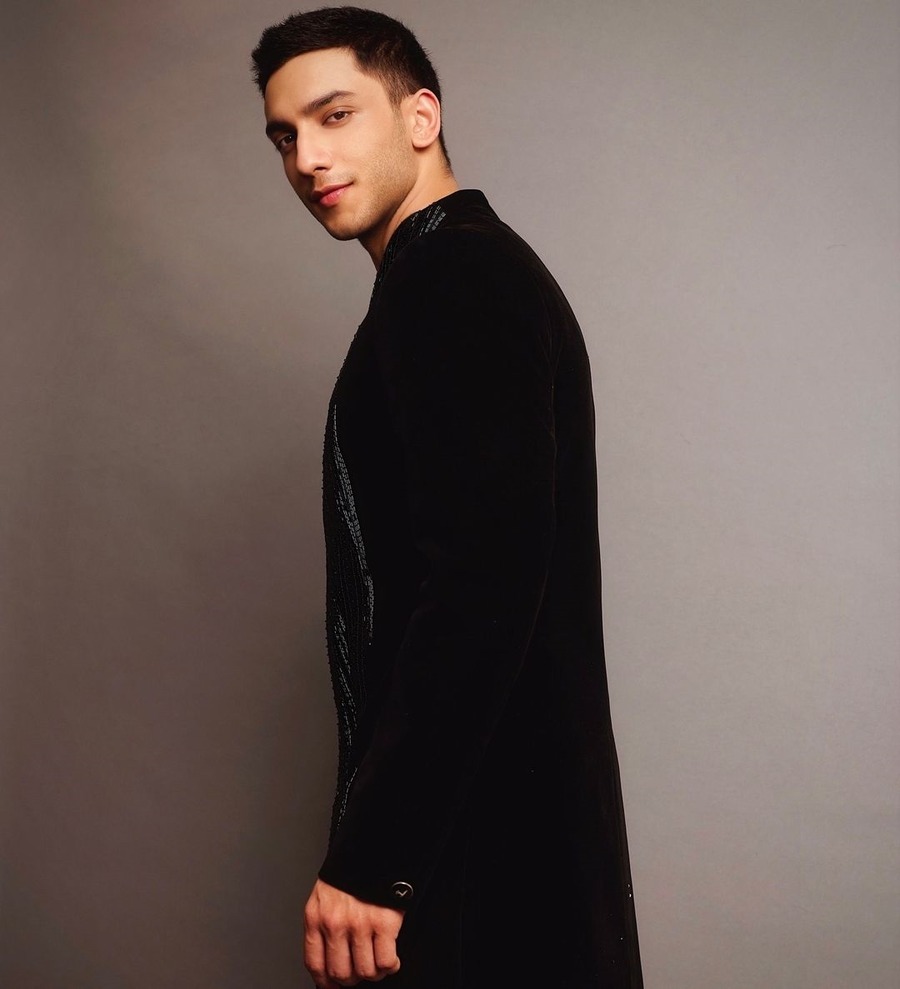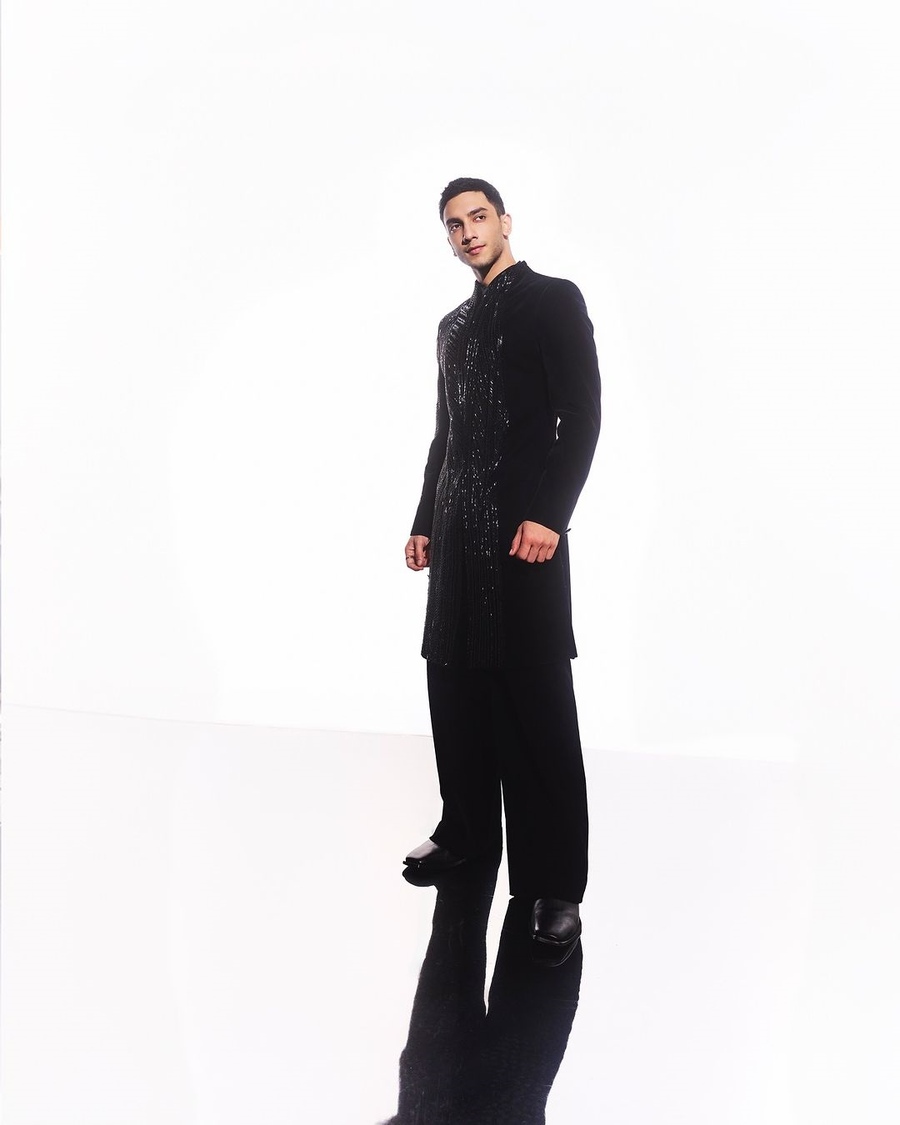 Vedang sported a black cosmic rays-themed jacket with a high neckline and long sleeves.