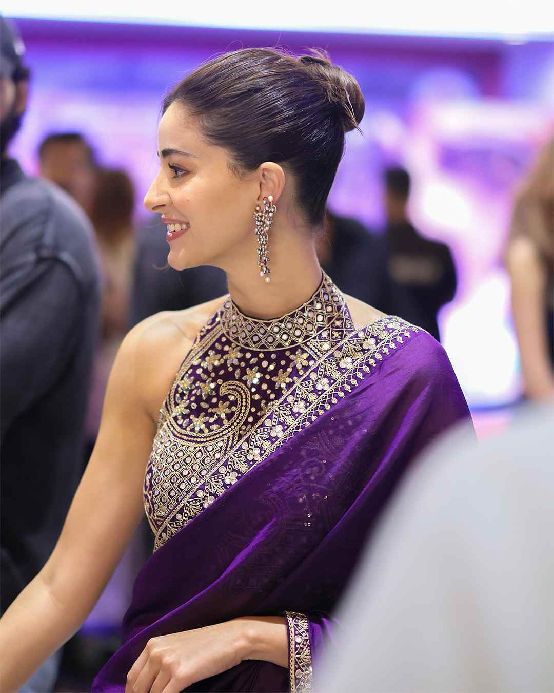 Ananya Panday, who plays Dilreet Gill in the courtroom drama, looked elegant in a purple sari paired with a halter-neck embroidered blouse.