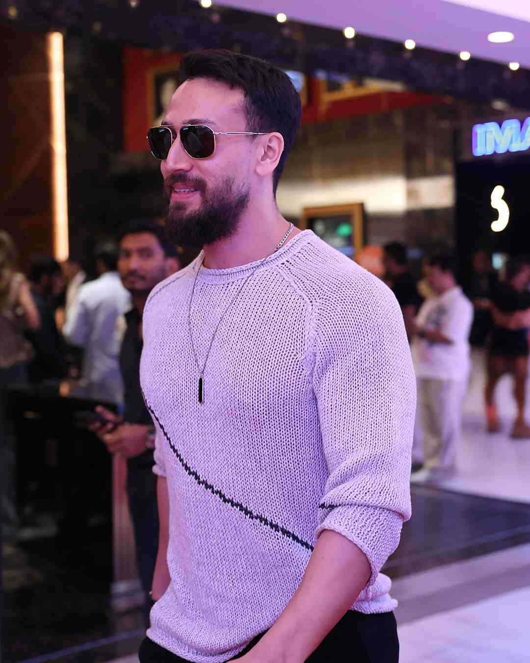 Actor Tiger Shroff looked stylish in an off-white knit mesh shirt. He rounded off his look with black shades.