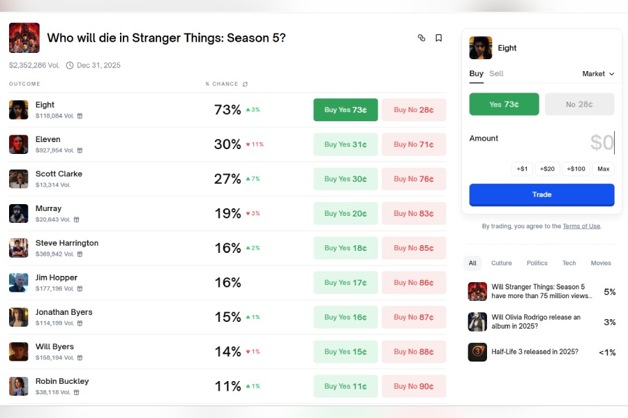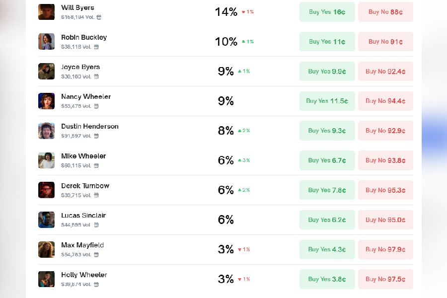 Ahead of the popular sci-fi fantasy show’s finale premiere on Netflix, the American prediction market is betting on Stranger Things characters’ fate on the show, according to a pool on Polymarket.
