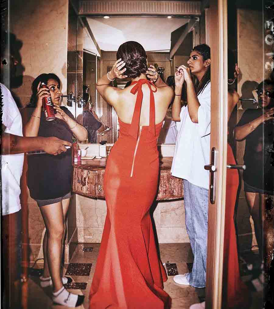 The hair and make-up team that brought the look together was captured working on the actress in front of the bathroom mirror.