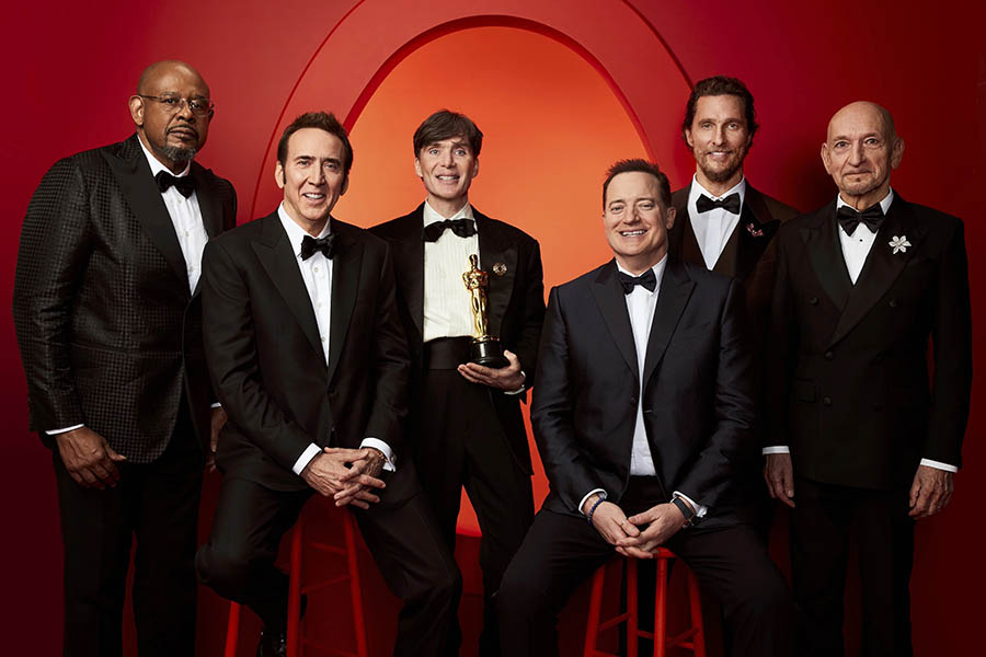 Cillian Murphy, who took home the trophy for best actor, is flanked by a bunch of past winners in this category who presented him with the award — (from left) Forest Whittacker, Nicolas Cage, Branden Fraser, Matthew McConaughey and Ben Kingsley.