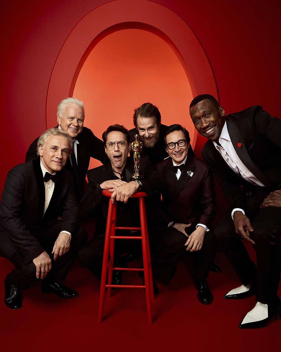 Past winners of the best supporting actor Oscar — (from left) Christoph Waltz, Tim Robbins, Sam Rockwell, Ke Huy Quan and Mahershala Ali — with this year’s winner Robert Downey Jr. (centre).