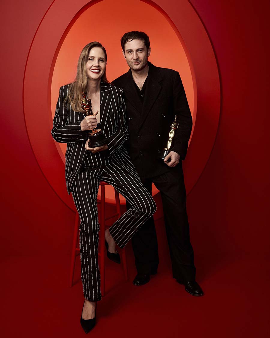 French filmmakers Justine Triet and Arthur Harari with their Oscar trophy for best original screenplay for Anatomy of a Fall.