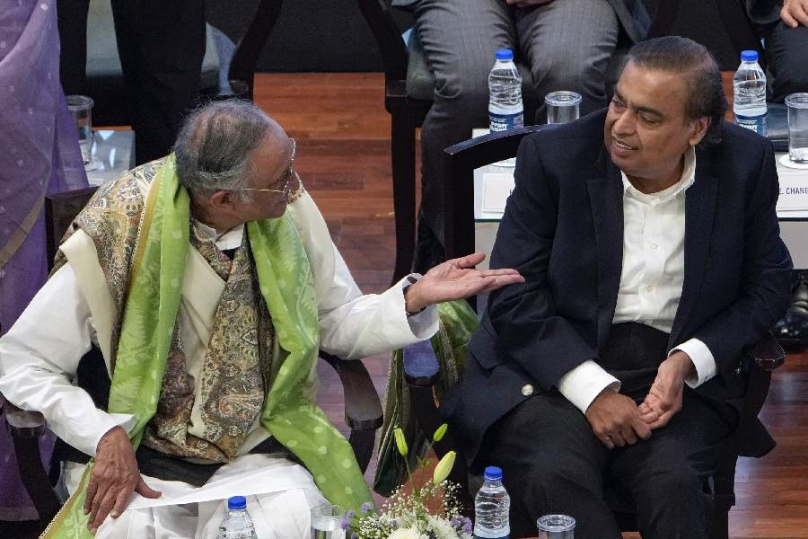 Reliance Industries Chairperson Mukesh Ambani and former West Bengal finance minister Amit Mitra seen sharing a candid conversation with each other.