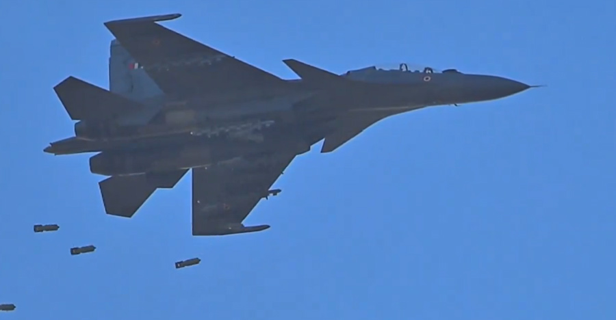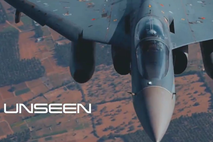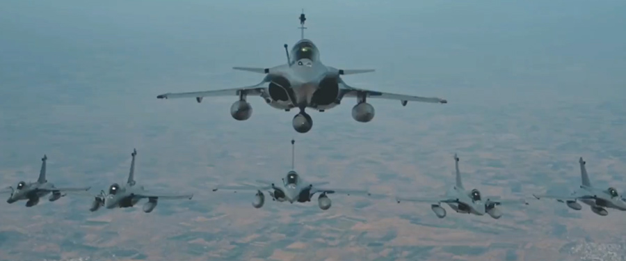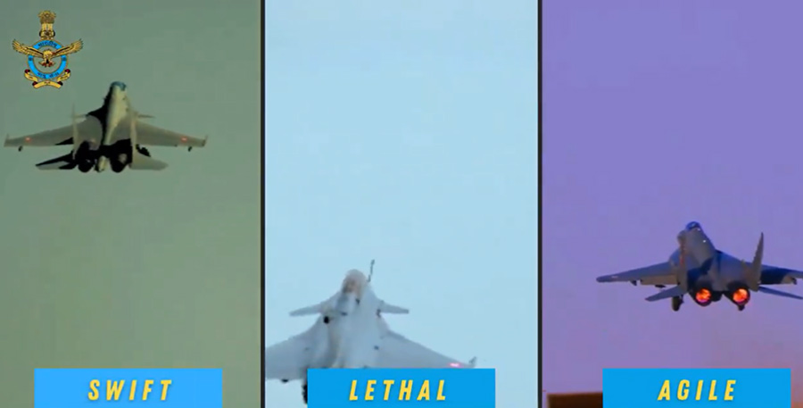 The visual montage includes frontline aircraft like the Rafale, Su-30MKI and Tejas roaring above mountains, accompanied by elite paratroopers and Special Forces engaged in intense combat drills.