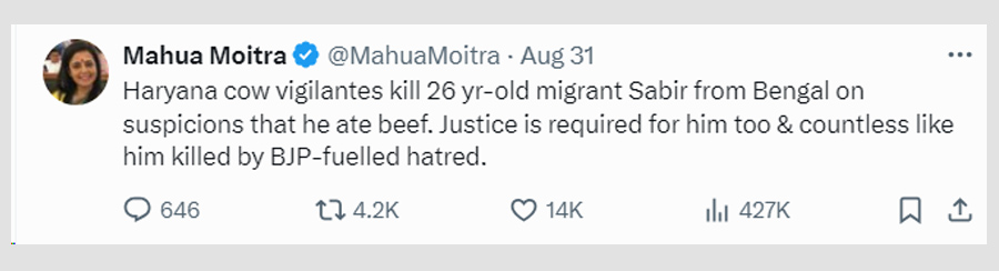 Till 12:50 pm on Tuesday, outspoken and fiery Lok Sabha MP Mahua Maitra had not reacted to Sandip Ghosh’s arrest. Instead the Trinamul leader highlighted national issues like cow vigilantes running amok and Union minister Chirag Paswan’s politics.