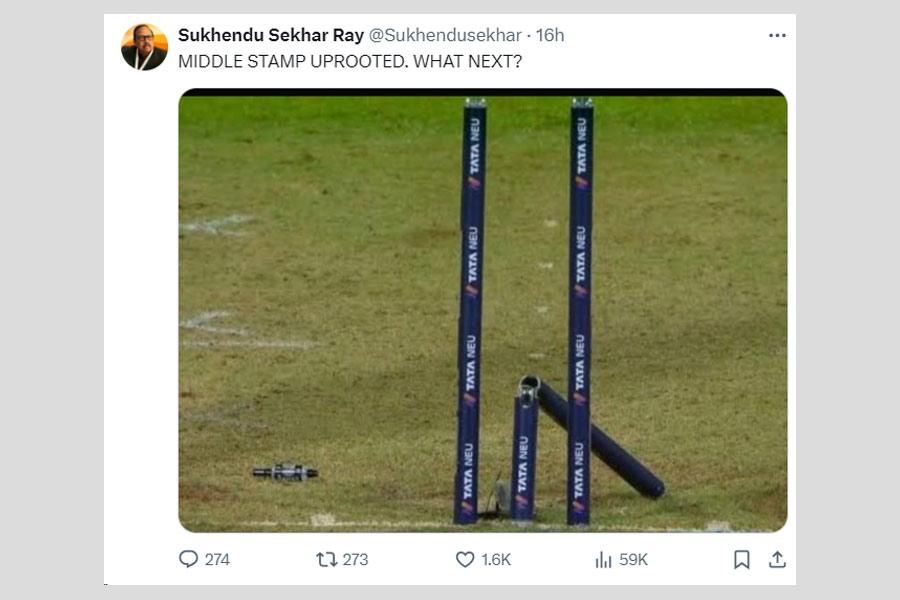 TMC Rajya Sabha MP Sukhendu Sekhar Roy posted a picture of a broken set of cricket wickets on X with a caption: “Middle stump uprooted, what next?”