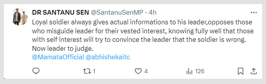 “Loyal soldier always gives actual informations to his leader,opposes those who misguide leader for their vested interest, knowing fully well that those with self interest will try to convince the leader that the soldier is wrong. Now leader to judge.” Sen wrote on X.