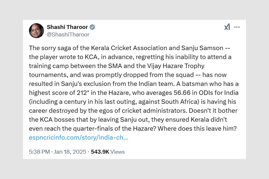 On January 19, Congress MP Shashi Tharoor had criticised the Kerala Cricket Association for mishandling Sanju Samson resulting in his exclusion from the Indian squad. He argued that Samson's impressive record is overlooked due to administrative egos, impacting both the player and Kerala cricket.