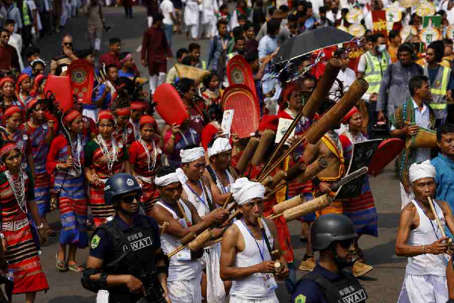 This year’s Shobhajatra was as defiant as it was decorative. National motifs like the royal Bengal tiger and ilish were also present.