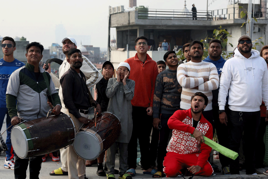 Kabootarbaaz (pigeon keepers) and spectators celebrate as their pigeons come back after covering a long distance, as the flocks are tested for distance and their ability to return against the wind, as part of pigeon flying competitions, which according to the keepers, are held annually, in the old quarters of Delhi.